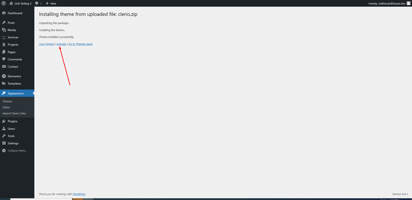 Once uploaded, activate the theme by heading to the “Themes” menu in the WordPress Dashboard. Locate the Clerio theme and hit “Activate”.