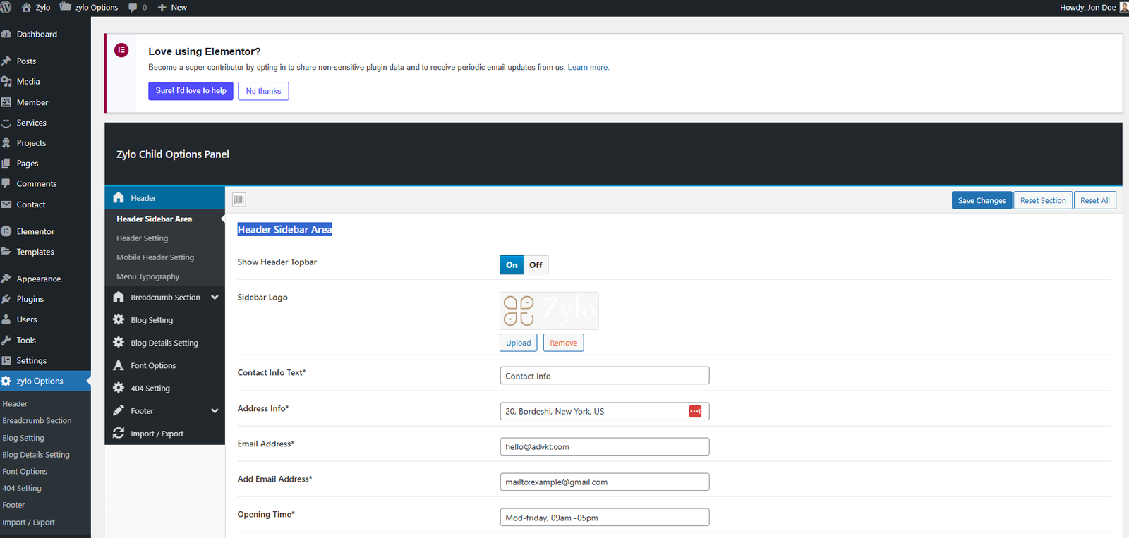 Customise → ZyloCustomizer → Header Sidebar Area Settings